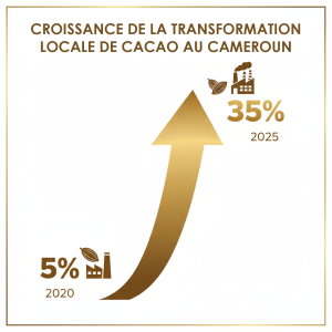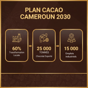 Le Plan Cacao 2030 affiche une ambition encore plus grande : transformer 60% de la production nationale, exporter 25 000 tonnes de chocolat fin, et créer 15 000 emplois industriels supplémentaires. Cette stratégie, à la fois industrielle et sociale, place le Cameroun sur la voie d’une véritable souveraineté économique, face aux marchés mondiaux de plus en plus volatils.