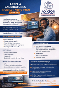 Dans le cadre de ses missions dans un projet stratégique pour l’un de ses clients, un cabinet de lance un appel à candidatures pour le recrutement de 2 monteurs audio-vidéo.